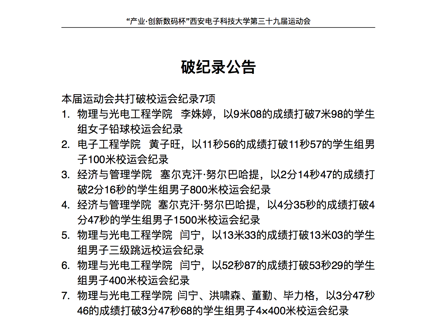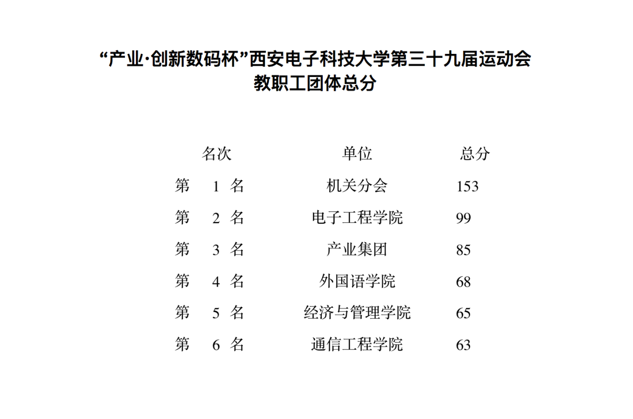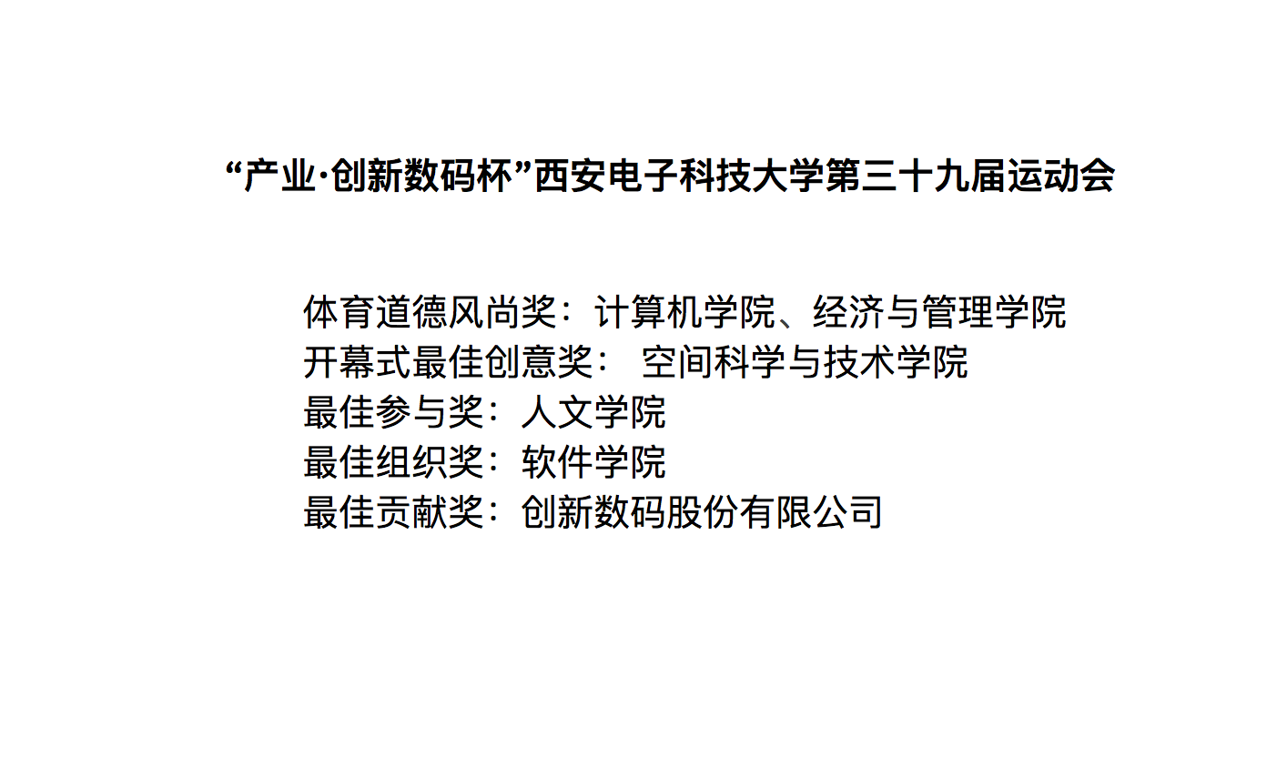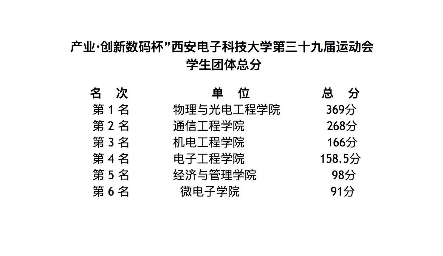 经过两天激烈的比赛,最终物理与光电工程学院获得学生组团体第一名,通信工程学院获得第二名,机电工程学院获得第三名。计算机学院与经济管理学院获得了体育道德风尚奖。另有7项校运会纪录被打破。副校长李建东和校工会常务副主席柏昌利分别为获奖单位颁奖,永利23411集团部长于少勇宣布第39届运动会圆满闭幕。