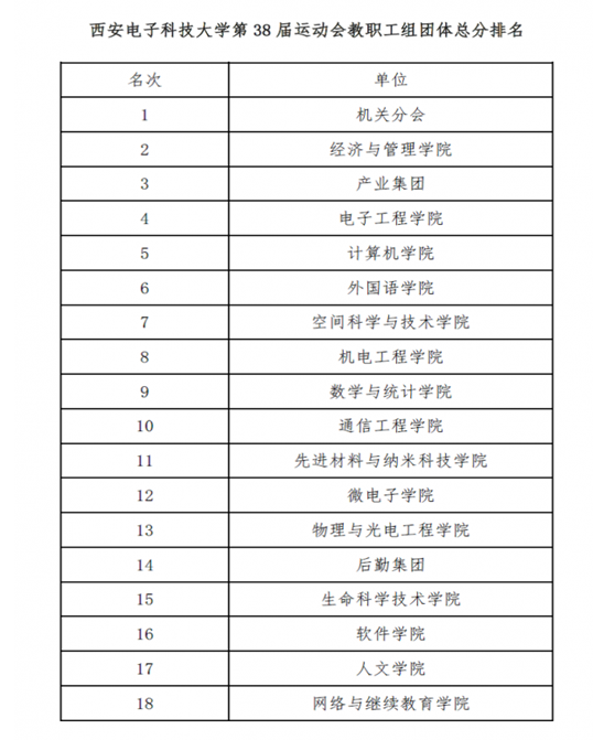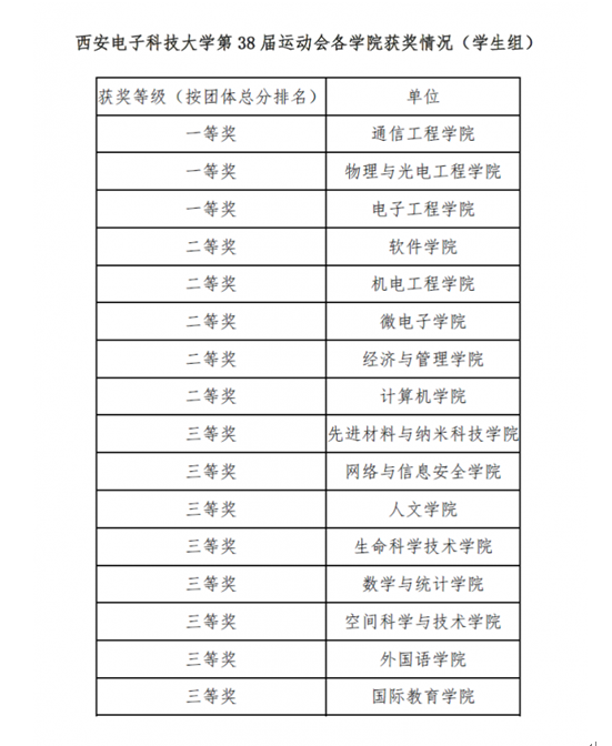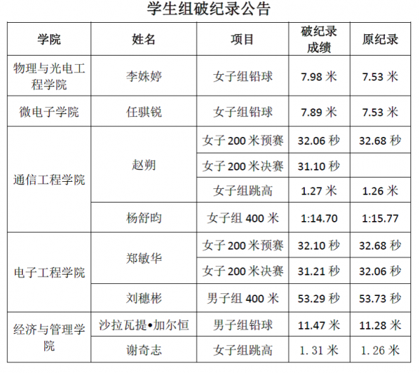 据悉,本次运动会设立田径和趣味2个大项,90个小项,并在奖项中首次设置了学生组破纪录奖。经过两天激烈的角逐,通信工程学院、物理与光电工程学院和电子工程学院分别获得学生组团体一等奖;机关分会、经济与管理学院和产业集团分别获得教职工组团体前三名;微电子学院和物理与光电工程学院获得体育道德风尚奖;电子工程学院和网络与信息安全学院获得最佳参与奖;机电工程学院和空间科学与技术学院获得开幕式最佳创意奖;最佳组织奖则由数学与统计学院和外国语学院获得。特别值得一提的是,学生组中共有8人11次打破6项校运会纪录。