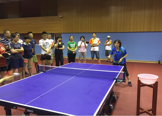 在中国乒乓球学院教学部主任王艳、中国乒乓球国家队文化教育部主任完好的陪同下,团队成员参观了国内一流的乒乓球教学训练场馆;观摩了教学部本科生乒乓球训练课、培训部对上海市中学体育教师乒乓球专项的培训课以及训练部部分运动员的训练课;同时团队成员还与王艳主任就乒乓球普通教学中的专项技术问题(乒乓球步法教学、乒乓球挑打技术等)和乒乓球教学理念进行了请教与探讨。