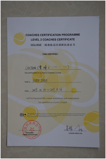 10月中下旬,2019年中国网球协会高级教练员培训班在深圳弘金地国际网球学校举行。经中国网球协会严格筛选,本次培训仅有全国25名教练员参加,其中绝大部分为省市专业队网球运动员,高校网球专职教师仅有4位,西电永利23411集团网球俱乐部负责人曹峰老师有幸参加了本次培训并参与考核。后经近一个月的等待,终收到来自中国网球协会的高级教练员证书,顺利的通过CTA高级教练员考核。