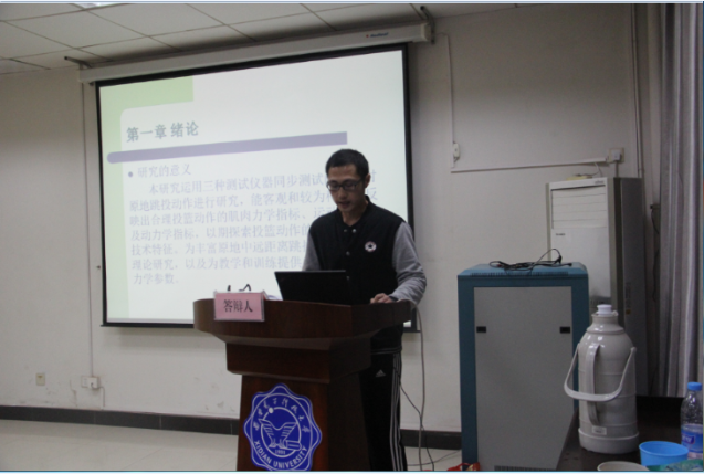 答辩会上,2013级体育教育训练学硕士研究生李玉林对其毕业论文《陕西省青少年篮球运动技能评价的理论和方法》,战鹏对其毕业论文《篮球罚球线原地跳投与三分线外原地跳投动作的运动生物力学分析》分别做了详细的陈述报告,答辩委员会成员在对两名学生较认真详尽的数据统计分析和调查论证表示认可的基础上,从论文立意、使用理论、论证方法、内容结构等角度先后对两名学生进行提问并指出问题。