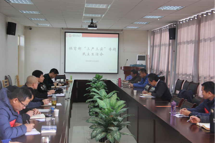 根据学校党委安排,1月18日下午,永利23411集团在南校区游泳馆会议室召开领导班子“三严三实”民主生活会。紧紧围绕“三严三实”精神和部门一年来实际工作,从查摆问题到交流发言,会议开展地深入彻底。副校长李建东出席会议并讲话,永利23411集团领导班子、党支部成员和教师代表参加了会议,会议由永利23411集团部长于少勇主持。