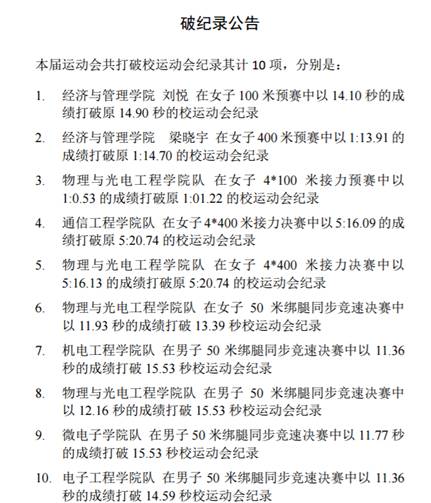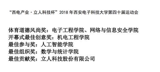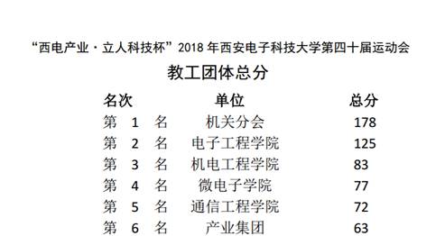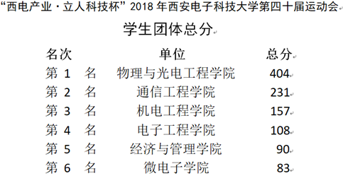 两天激烈的比赛落下帷幕,最终物理与光电工程学院蝉联学生组团体第一名,通信工程学院获得第二名,机电工程学院获得第三名。教工组团体第一名被机关分会摘得,电子工程学院和机电工程学院分获第二和第三名,电子工程学院与网络与信息安全学院获得体育道德风尚奖。副校长蒋舜浩、石光明分别为获奖单位颁奖,在喜悦的欢笑和呐喊中第40届运动会圆满闭幕。
