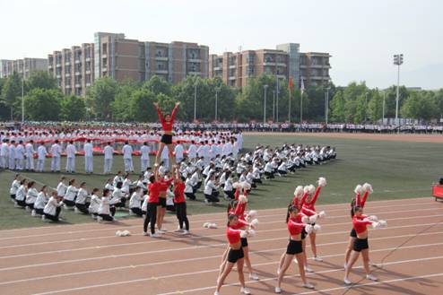 大型文体表演“舞动青春,争创一流”开始了,五千名大二学子齐做广播操,整齐划一,场面宏大。400名男生舞动太极扇,举手投足大气恢宏,尽显中华武术之精髓,由健美操选项班女生和校健美操队带来的啦啦操、活力操表演点燃激情。