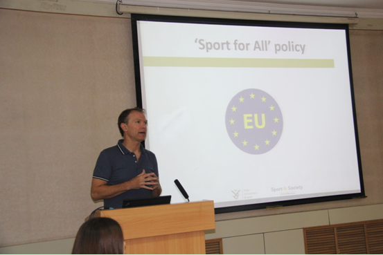 Marc教授首先向大家简单介绍了比利时、布鲁塞尔自由大学以及他个人的基本概况。接着,Marc教授从运动与社会这一大的研究课题出发,探讨在微观和中观层面上运动对于个人发展及社会发展的影响,精英竞技体育和民间运动分别和个人以及社会的发展关系。随后,Marc教授通过展示自己近年在欧盟进行的一系列实证调查研究的成果后,向在席听众提出自己的问题:不论是欧洲还是中国,在经济、社会发展的今天,“大众体育”是否真的得到了实现?最后,他向大家抛出一个发人深省的课题:“究竟如何才能让每一个人都能积极参与运动?真正做到大众体育,全民运动?”结束了演讲,带给大家无尽的启示和思考。