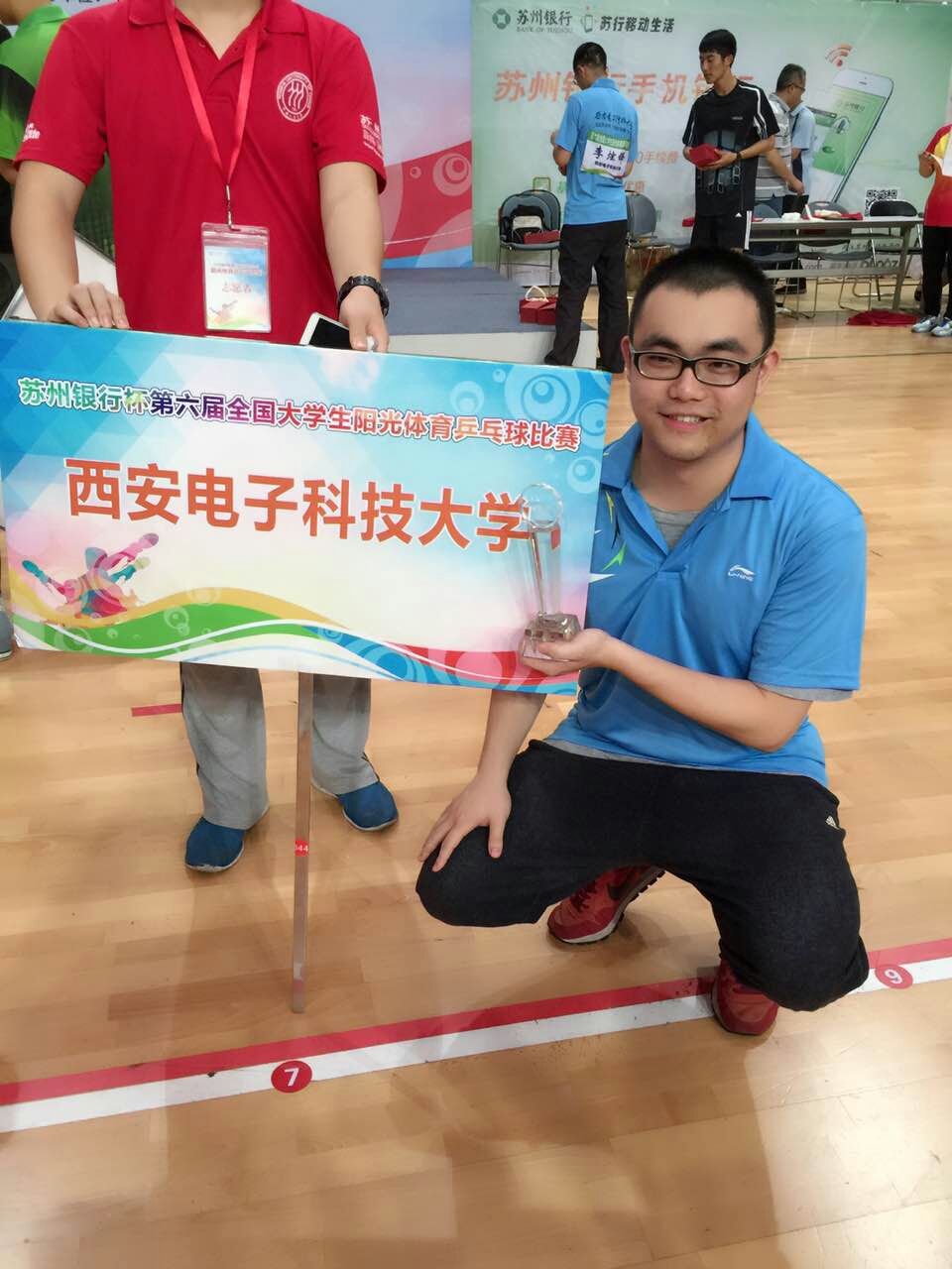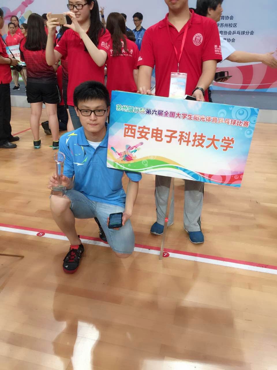 我校首次参加全国大学生阳光体育乒乓球比赛,由严鸣副教授任主教练,队员为电子工程学院021212班的邵帅、机电工程学院041111班的庄靖延、通信工程学院13101013班的李炫锋、011215班的吕欣、赵朔和物理与光电工程学院011231班的杨阳等六名在校本科大学生。经过两天的鏖战,我校代表队一路战胜浙江大学、南京大学、上海交通大学等强队,闯入决赛,斩获佳绩,取得团体冠军、全国一等奖的优异成绩,邵帅、杨阳两位同学还获得了“全胜运动员”称号。