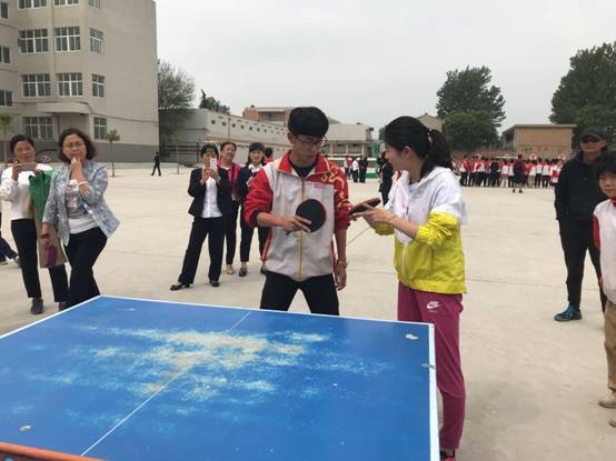 捐赠仪式结束后,西电体育老师与罕井镇中学师生展开了篮球联谊赛和乒乓球展示赛。这边,乒乓球案旁,西电乒乓球老师手把手指导罕井学生乒乓球的姿势摆位和打法技巧,给同学们答疑解惑做示范,引得围观的学生们跃跃欲试,纷纷摩拳擦掌要上阵实践。那边,在双方体育教师之间展开的篮球比赛激烈地进行着,奋力的拼抢、漂亮的投篮,掀起场上一阵阵欢呼。热烈的气氛映衬罕井中学操场墙面的大字“运动奏响生命,运动点燃激情”愈发生动醒目。