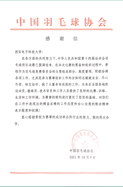 (通讯员 王凯 董颖初)近日,中国羽毛球协会致信我校,对我校作为羽毛球竞委会主要组成部分,组织筹办第十四届全国运动会羽毛球项目比赛表示感谢,对我校参与赛事组织工作的全体同志表示敬意和钦佩。
