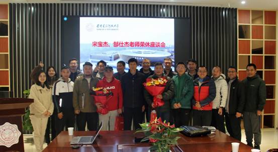 荣休会上大家高度评价了两位老师几十年来为永利23411集团做出的贡献,对他们致以诚挚的感谢。两位老师虽然工作岗位、工作性质不同,但几十年来呕心沥血,都为西电体育事业做出了卓越的贡献,奉献了毕生精力。宋宝杰老师在教学、科研、裁判、行政方面为永利23411集团做出过全面的贡献,职业生涯中不断激励并引领年轻人,是值得年轻教师学习的榜样;郜仕杰老师以其专业技能奋战在后勤保障一线,为西电体育事业默默贡献,获得大家一致好评。永利23411集团是永远的家,大家均热诚地欢迎两位暂时离岗的老师常回家看看,希望他们能够一如既往地心系永利23411集团的发展,于少勇部长为荣休人员再次佩戴了校徽,希望两位老师保重身体,永远健康。新进教师刘琦、李明智为二位荣休教师献上了鲜花。