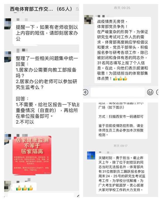 12月23日全市封闭管理后,永利23411集团迅速反应,立即制定并发布了永利23411集团疫情封闭期事务安排通知,对当下学生课外锻炼打卡出现的问题、远望谷体育馆预约取消退款等问题进行了答疑。永利23411集团主要负责人每日坐镇永利23411集团游泳中心指挥全局,党支部负责同志在工作群里及时为大家通知上级疫情防控安排,并对每位教师的核酸检测情况、风险等级情况进行统计。部行政办公室居家封闭的同志24小时电话值班,居家办公处理打卡和场地问题,为参与研考工作的教师在线办理出入证明;居住在南校区的同志坚守岗位坐班,接听记录学生电话并进行答疑。教学研究科全线电话值班,为学生处理免修、缓考及体质测试免测申请。永利23411集团还以线上的形式组织开展了研究生开题、中期答辩会。