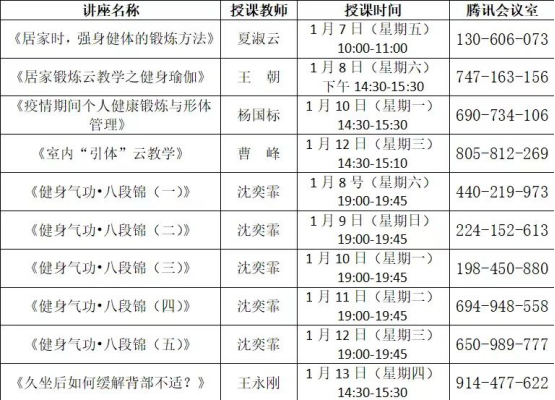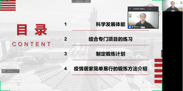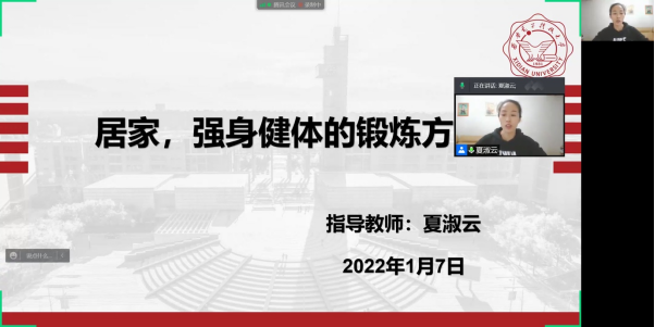 与此同时,考虑到居家健身过程中有些同学会对如何采用科学合理的室内锻炼方式有疑问,永利23411集团教学科还为学生准备了室内体育健身“云课堂”,为大家带来专业的室内健身在线指导。由夏淑云、王朝、杨国标、曹峰、沈奕霏、王永刚等老师在腾讯会议app上从1月7日至1月13日开设10节在线直播课程。