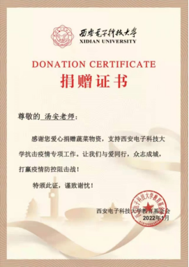1月3日,永利23411集团教职工汤安同志个人向学校捐赠了近二吨的蔬菜。当日中午,此批蔬菜已全数安全无损地送达学校,极大并及时补充了学生餐厅的蔬菜供应需求。为感谢他的光荣爱心举动,学校教育基金会和陕西省慈善协会分别向他颁发了证书。