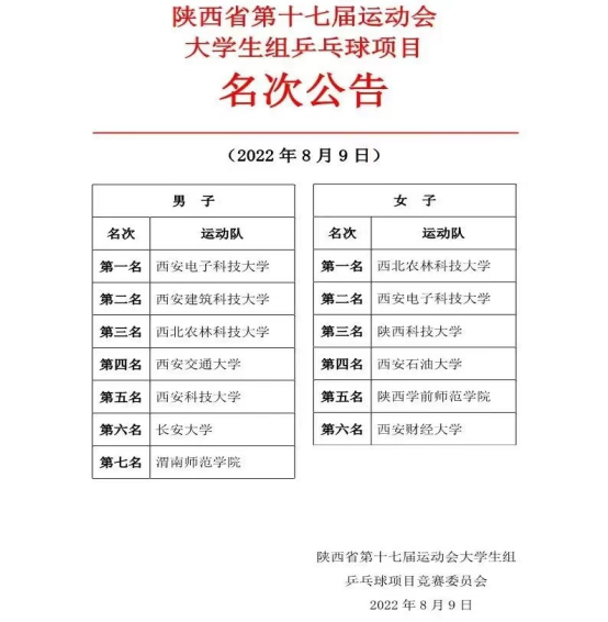 2022年8月7日至9日,陕西省第十七届运动会大学生组乒乓球项目在榆林市职业教育中心举行。来自西安交通大学,西北农林科技大学、永利yl23411集团等高校的12支代表队共98名运动员进行了为期三天的激烈角逐。 西电乒乓球代表队由詹歌老师担任教练,带领我校14名学生参加了男子团体、女子团体比赛。由7名队员(王纯鑫、王晨旭、张骋昊、焦一宁、乔敏达、郭丰源、杨文博)组成的男子团体在小组赛负于西安交通大学的情况之下,认真调整心态,总结得失,奋力拼搏,在半决赛中,丢掉思想包袱,以3:2战胜由2022年省锦标赛男单冠、亚军组成的西北农林科技大学男团。比赛中,来自电子工程学院的王晨旭,在大比分1比2,小比分7比10落后的情况下,奋起直追,以3比2战胜对手,拿下关键一分;决胜场中来自电子工程学院的焦一宁在第四局6:10落后的情况下放手一搏,以13:11获取胜利,西电代表队在响彻体育场的欢呼声中进入男团决赛。决赛对阵2022年省锦标赛男团冠军西安建筑科技大学,面对强敌,他们无所畏惧,赛前认真分析对手,商量排兵布阵,甩掉思想包袱,轻装上阵,来自电子工程学院的王纯鑫在第三局6:10落后的情况下,绝地翻盘,最终3:2险胜,拿下关键一分;第三场来自海棠2号书院的张骋昊技术运用得当,战术思路清晰,以3:1战胜对手,锁定胜局,最终以大比分3比0战胜西安建筑科技大学,西电男团捧起了冠军奖杯。