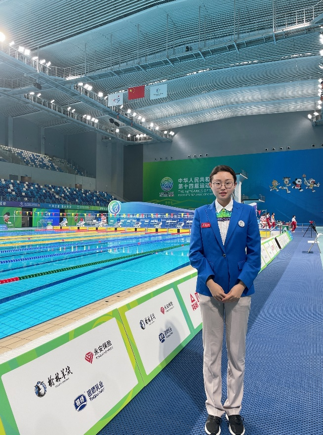 此外,在孟欣雨同学思想和能力进步的同时,秉承”厚德 求真 砺学 笃行”的校训,以严谨的工作态度,职业的工作作风,最高最严的标准要求自己,争取为学校、为社会做出更多的贡献,用所学到的知识和专业技能回馈社会,受到业界各位领导、老师的一致好评。三年来,她以裁判员身份参与省市级别游泳赛事5场。2021年,她以技术官员的身份参加第十四届全国运动会马拉松游泳项目测试赛暨陕西省马拉松游泳公开赛;同年9月,参加中华人民共和国第十四届运动会游泳项目,并获“保赛标兵”称号;同年10月,以技术官员身份参加中华人民共和国第十一届残运会游泳项目,这是我校学生首次以学生身份担任我国规格最高、水平最高、影响力最大的综合性体育赛事技术官员工作,其本人也获得优秀裁判员及体育道德风尚奖。孟欣雨说:“这使我身为西电人及体育人的荣誉感、自豪感、归属感又多了一些!”