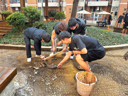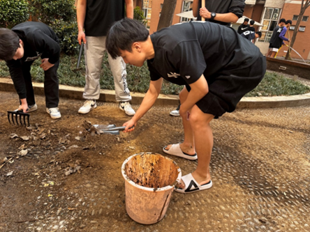“花径不曾缘客扫,蓬门今始为君开”,许久未有人踏足的海棠4号书院内庭院将于3月8日举行揭牌仪式,本次劳动实践活动以此为契机,以打扫内庭院为主要内容,参与的同学也因此有了更多的使命感。下午两点三十分,在书院团工委、辅导员齐欣老师、林帅老师的指导下,生活委员带领大家有条不紊地展开活动,清理庭院落叶、清除杂草,铲除院内淤泥、擦拭院内长椅、清扫小路等等,各位同学积极参与其中,各样工具轮番上阵,干的热火朝天。