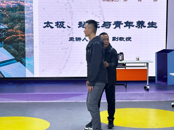 邱晨老师首先向在场同学抛出“青年学生中对‘养生’概念了解多少?”这一问题,使得同学们分享了他们在现实生活里对相关问题和现象的理解与感悟。随后邱老师为大家解释了传统文化语境下“中国武术”的内涵,向各位同学讲演“太极拳”与“站桩”这两种传统武术的练习方式,分享了传统文化蕴含的重要思想价值和实践价值。邱老师带领同学们学习了正确的“站桩”姿势,并结合自身经历谈了谈此练习可以有效带来缓解身体疲惫,纠正不良体态,满足养生等积极效果。最后,邱晨老师告诉大家,诸如中国武术之类的传统文化是我们中华民族一脉相承的优秀文化,他表示青年更是理解并传承中华传统文化的骨干力量,他鼓励大家积极主动弘扬和继承传统文化,增强民族自信,利国利身。