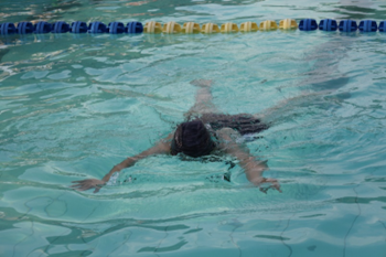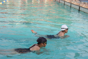 来自数统院的叶峰老师此前有一点点蛙泳基础,但处于“游不走”的阶段,本次被分配到蛙泳进阶班,腿部动作经过苏振阳老师的纠正,现在游得快多了,已进阶到泳池往返耐力训练阶段。
