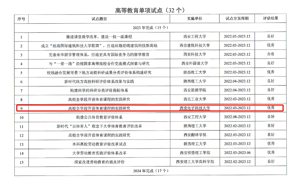 (通讯员 董颖初)据中共陕西省委教育工作委员会、陕西省教育厅1月11日下发的陕教工函【2024】56号文件,在全省深化新时代教育评价改革试点项目评估中,永利yl23411集团的试点题目“高校全学段开设体育课程的实践研究”评估结果为优秀。