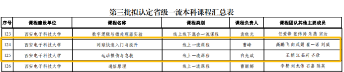 (通讯员:崔一诺 董颖初)2024年1月26日,陕西省教育厅公布第三批省级一流本科课程认定结果,其中,我部白光斌教授负责的《运动损伤与急救》与曹峰副教授负责的《网球快速入门与提升》均入选陕西省线上一流课程。据悉,本次一流课程认定共报名1497项,立项851项,其中体育类17项,西电是陕西省内除了西安体育学院(11项)外,唯一一所两门体育课程同时获批的高校。