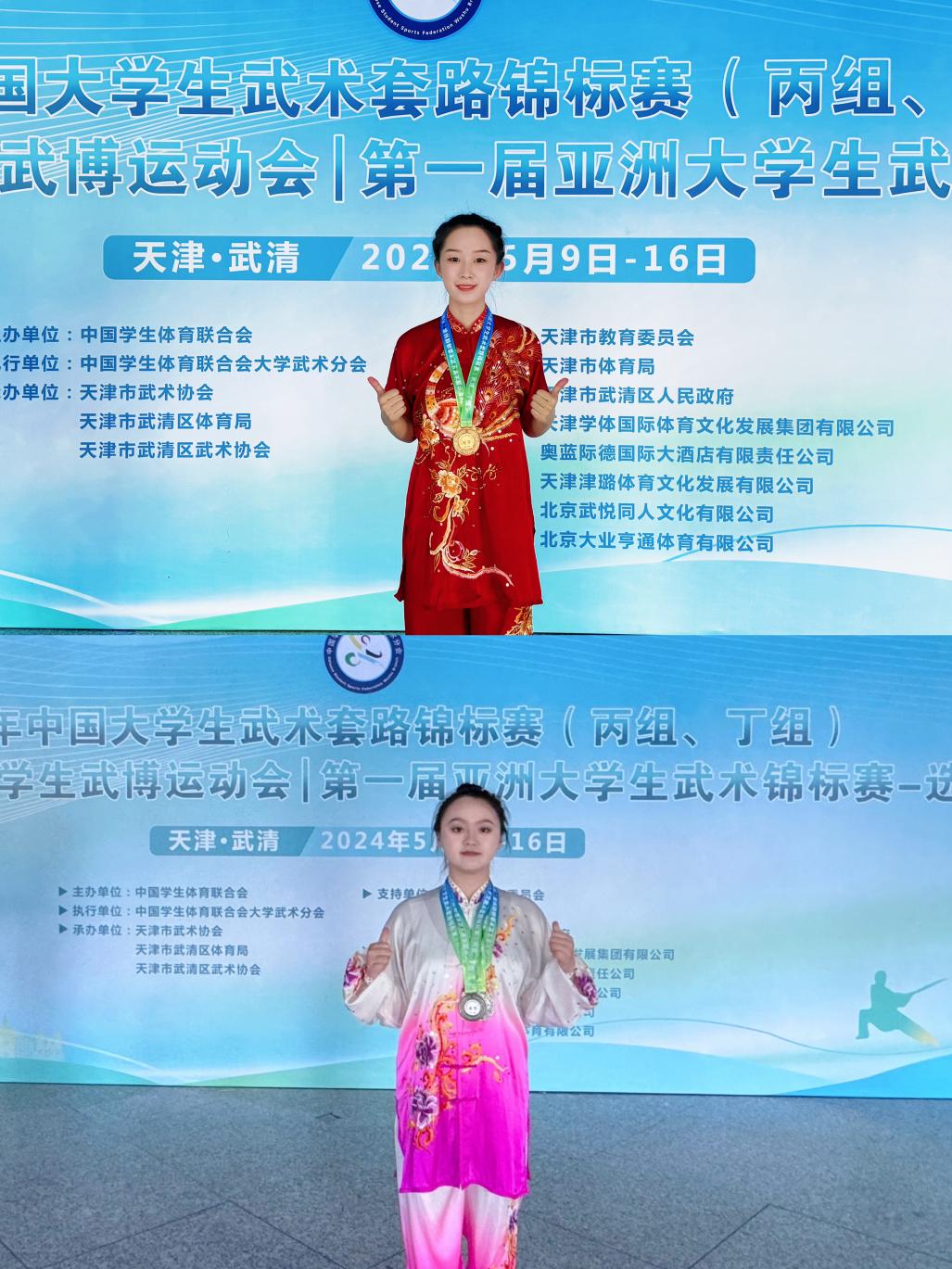 (通讯员沈奕霏 李晨然 李婉琳)5月9日—16日,为期8天的2024年中国大学生武术套路锦标赛(专业组)暨第一届亚洲大学生武术锦标赛选拔赛在天津市武清区圆满落幕。本次比赛由教育部中国学生体育联合会主办,共有来自清华大学、复旦大学、浙江大学等全国100多个参赛队伍、1000余名运动员参赛。经过激烈角逐,学校武术队两名运动员在赛场上挑战自我、奋发拼搏,最终斩获1枚金牌、3枚银牌的优异成绩。