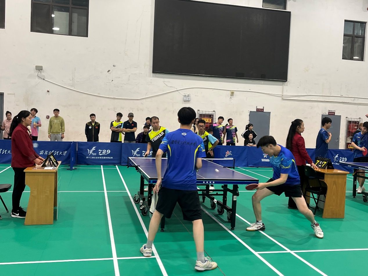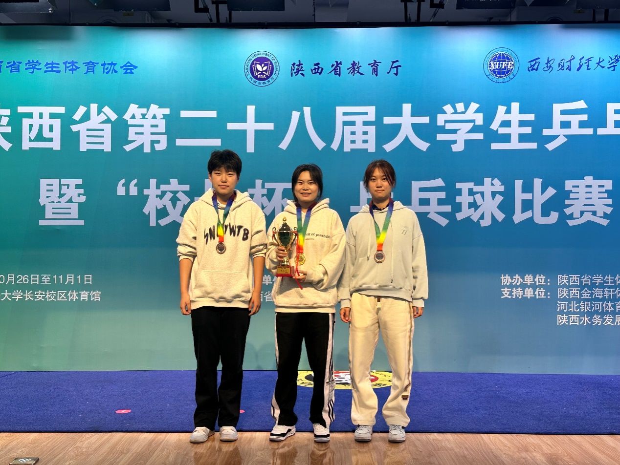 在甲组女子团体赛的激烈角逐中,参加女子团体的五名队员(韩婉秋、史雅斐、陈宝丽、林芷然、刘娴雅)赛前积极训练,适应场地,在小组赛中发挥出色,以两个3-0战胜西安航空学院和陕西警察学院,以小组第一的成绩强势出线。接下来的淘汰赛甚是焦灼,一度战至平局,在大比分2-2,小比分2-2,决胜局7-10落后的情况下,史雅斐坚定信念,敢于出手,最终连胜5个球,以12-10拿下比赛,助力女团进入八强。在八进四的淘汰赛中,对阵长安大学,女队依旧奋力拼搏,秉持球不落地、永不放弃的精神,最终以3-2战胜长安大学,进入四强,勇夺女子团体第三名的好成绩。
