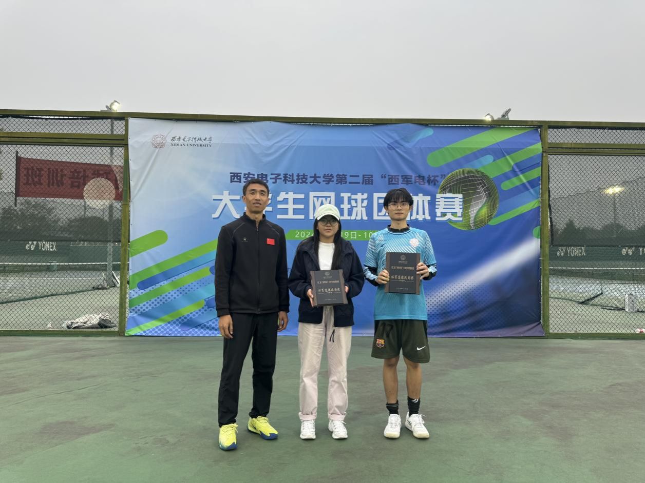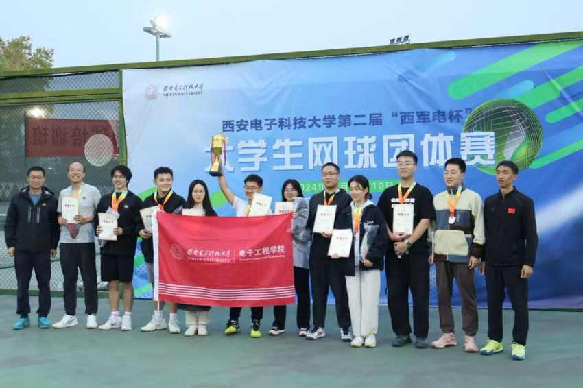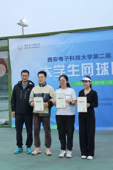 比赛采用第一阶段小组循环,第二阶段淘汰赛制,单场团体赛分为男子单打、女子单打、师生双打、男子双打、男女混合双打五场比赛。12支队伍共144名参赛师生经过150场激战,决出前八名。最终机电工程学院荣获冠军,电子工程学院获得亚军,通信工程学院获得季军,网络与信息安全学院位列四强,光电工程学院、微电子学院、人工职能学院、新生书院分获第五到八名。永利23411集团党总支书记张玉振,永利23411集团群体办主任蒙鹏君,网球教研室主任韩永玺为获奖队伍颁发了奖杯和证书。