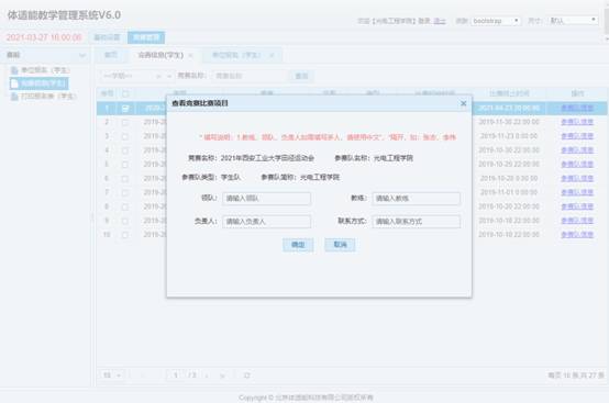登录系统后,点击“群体竞赛”--“赛前”--“完善信息”,在显示的列表中,点击对应的竞赛后的“参赛队信息”,打开页面,添加对应的信息,添加好后,点击“确认”。