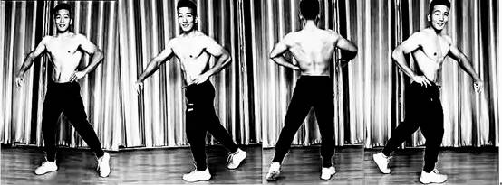 项目分别将所有比赛获得前三名的男、女子运动员分别进行决赛,比赛按照男女健身比赛动作造型(附2,附3)进行四个转体进行展示。