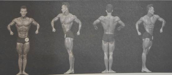 男子健体比赛预赛按照签号顺序,依次不超过8名运动员为一组进行进行四次向右的转体,身体方位分别是正向站立、左侧向站立、背向站立、右侧向站立进行形体展示。