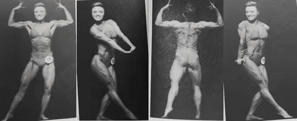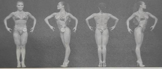 女子健体比赛预赛按照签号顺序,依次不超过8名运动员为一组进行四个造型展示,四个动作造型分别是正展双肱二头肌、侧展胸部、背展双肱二头肌、侧展肱三头肌进行形体展示。