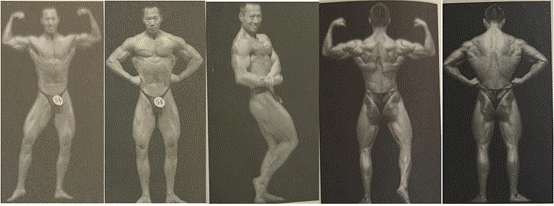 男子健美比赛预赛按照签号顺序,依次不超过8名运动员为一组进行5个造型动作展示,动作分别为:正展双肱二头肌、正展双背阔肌、侧展胸部、背展双肱二头肌、背展双背阔肌。