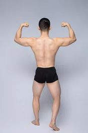 男子健美比赛要求选手拍摄5个造型展示,动作分别为:正展双肱二头肌、正展双背阔肌、侧展胸部、背展双肱二头肌、背展双背阔肌。