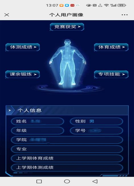 注:学生可在画像界面查看体育成绩、体测成绩、打卡次数、参赛情况及体育获奖情况等信息;教工可点击“课余锻炼”查看个人运动情况。