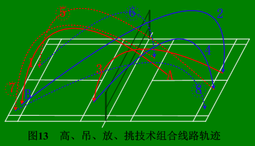 ①测试方法:如图13所示,1-A发高远球,2-B回击高远球,3-A吊网前,4-B挑后场;5-A回击高远球,6-B吊网前,7-A挑后场,8-B回击高远球(两人随机两次测试机会)。