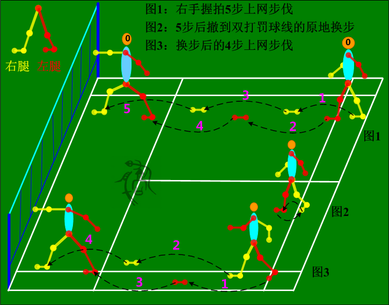 4、后退最后一步与下一轮步法衔接时, 必须有一个击球换步动作。