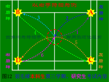②测试要求:1.必须按照A、B、C、D顺序完成;2.到达各点必须持拍手触点;3. 最后一步必须采用持拍手与持拍脚同侧跨步;4. 每次转身回动,必须面对球网;5.每次回动必须经过中心位置。