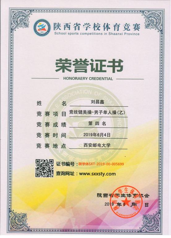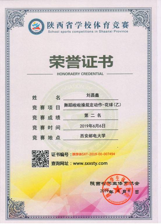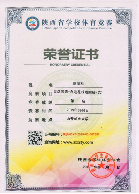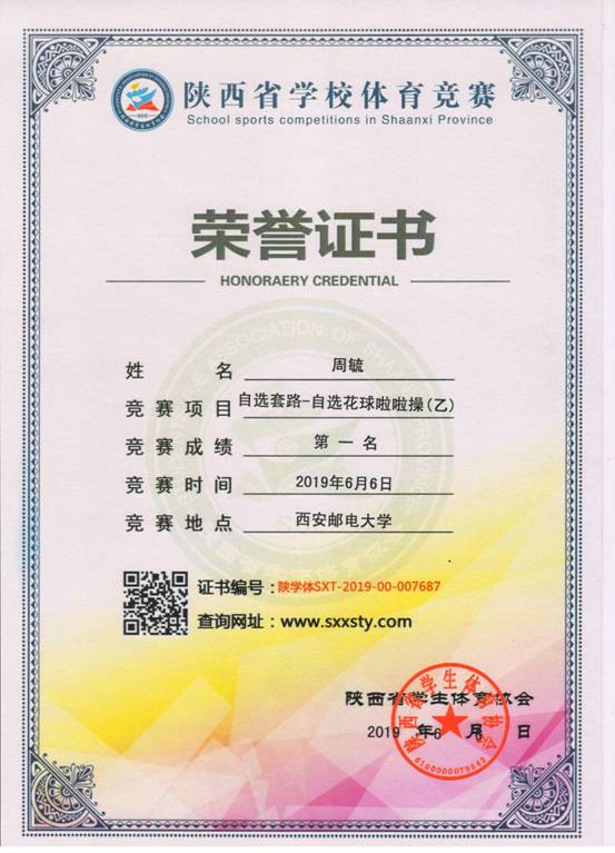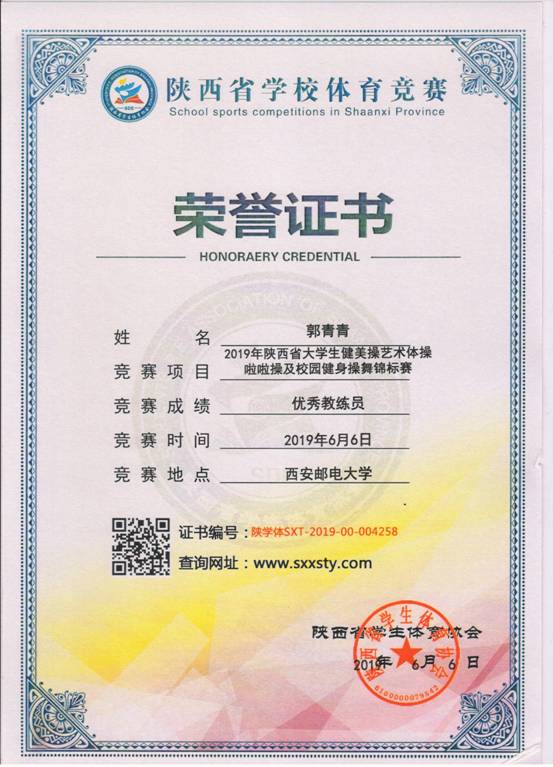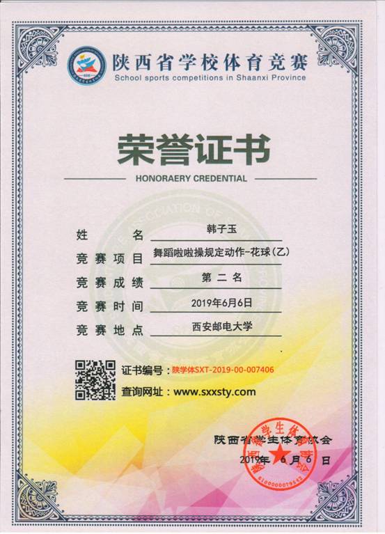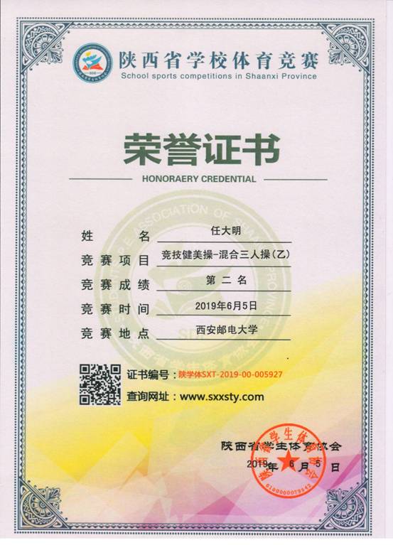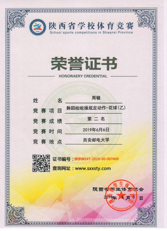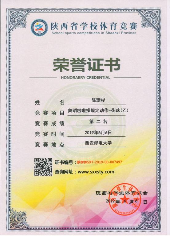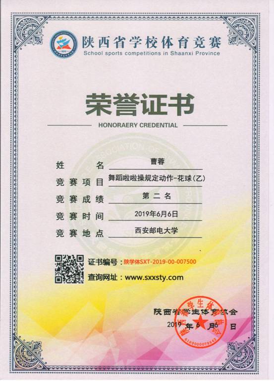 6月6日,在陕西省大学生健美操艺术体操啦啦操即校园健身操锦标赛中喜获乙组自选花球第一名、乙组男子单人操第一名、乙组三人操第二名、乙组女子单人操第二名、乙组规定花球第二名、乙组女子单人操第三名。