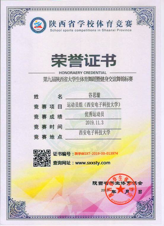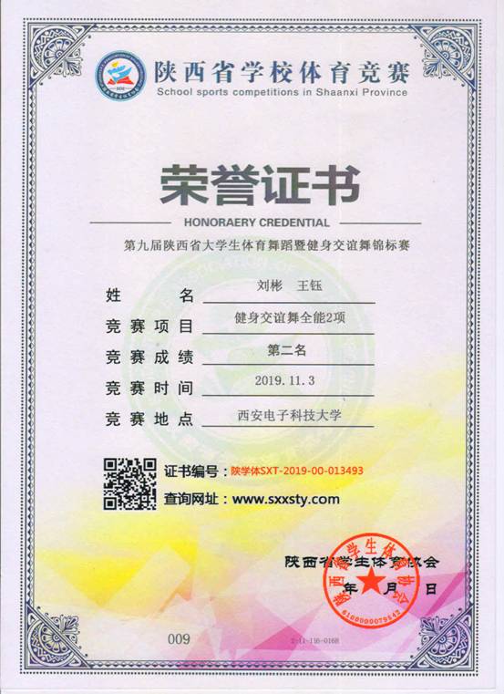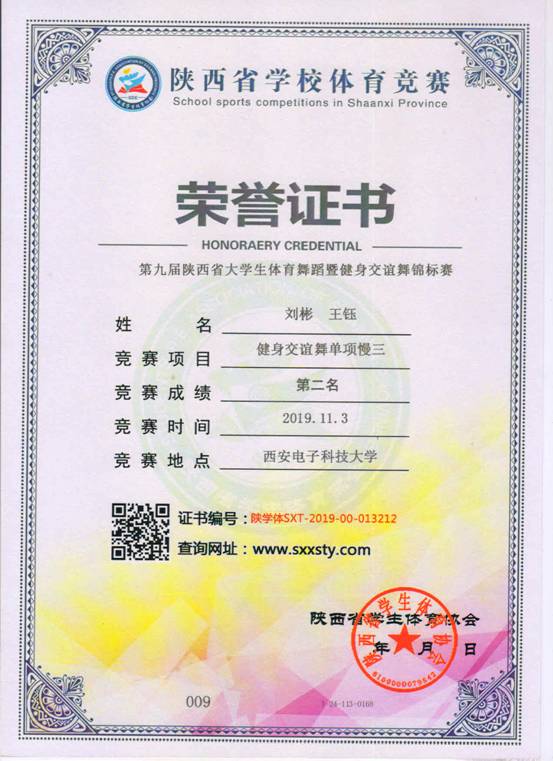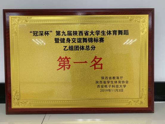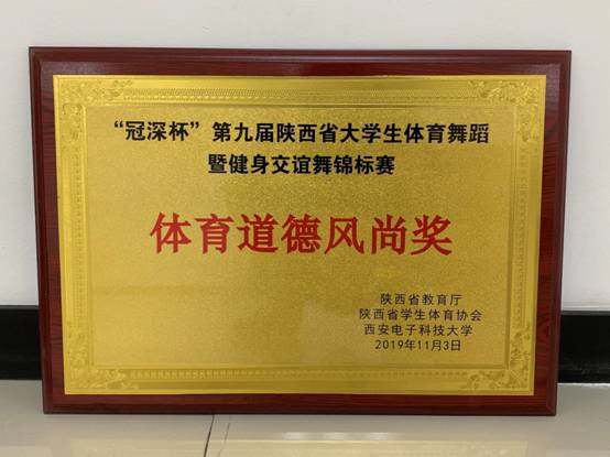 11月2-3日,在陕西省大学生体育舞蹈大赛中我校获得优异成绩:健身交谊舞单项莎尔莎冠军、健身交谊舞单项慢三亚军、健身交谊舞全能2项亚军并获得体育道德风尚奖。