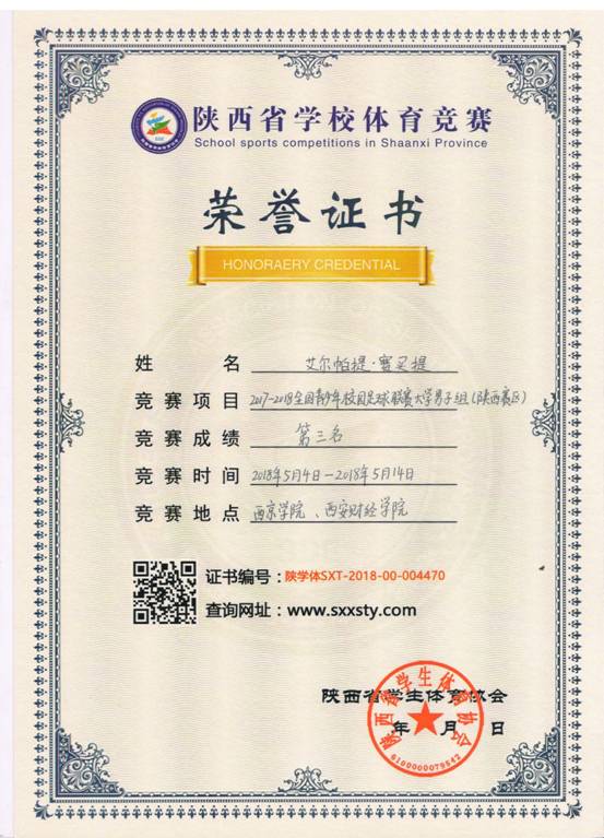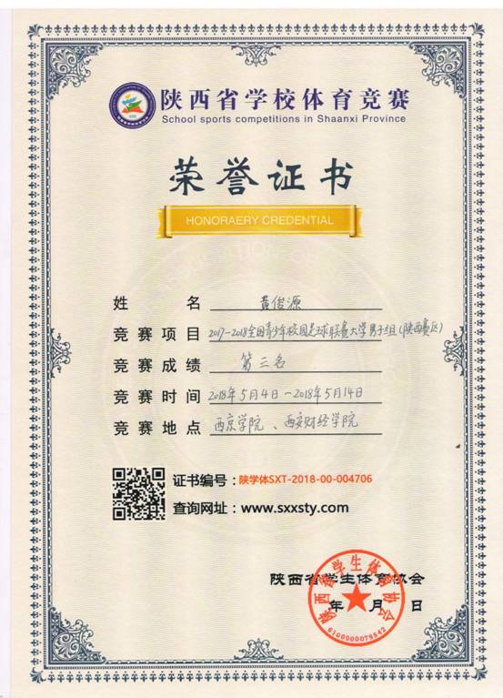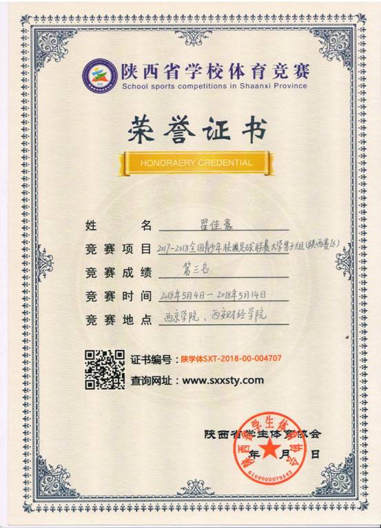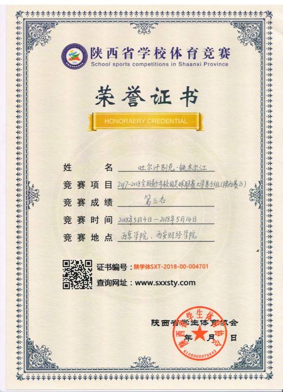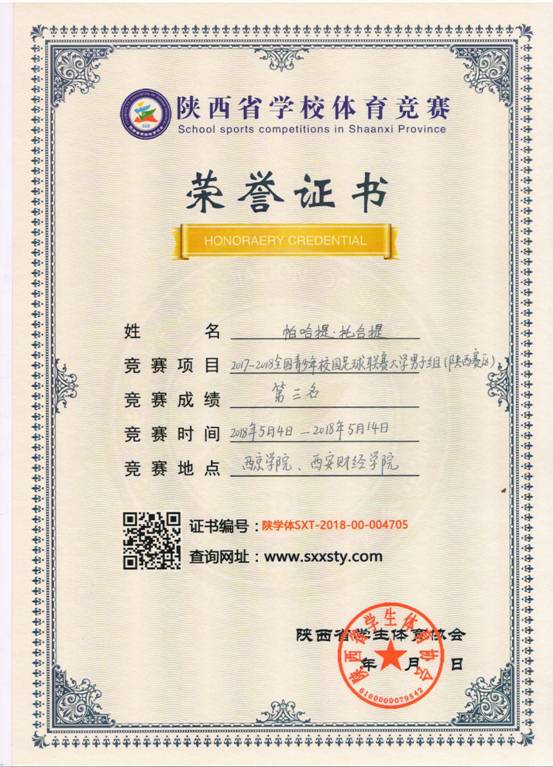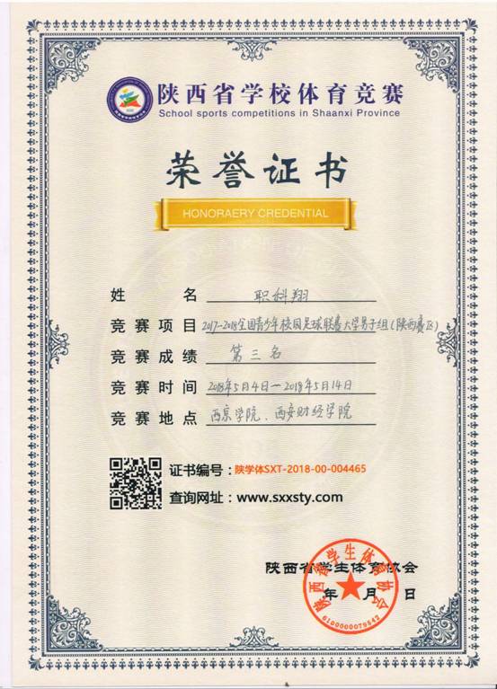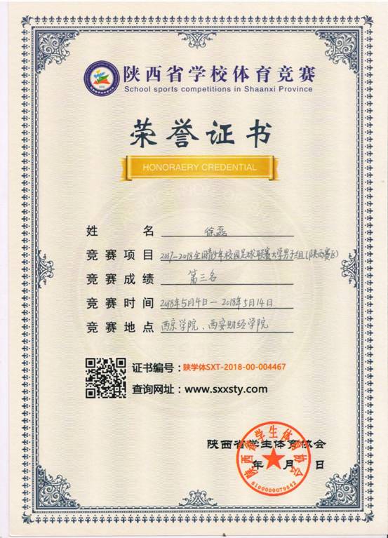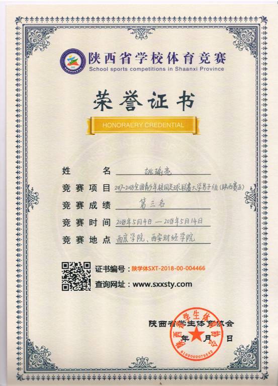 2018全国青少年校园足球联赛大学男子组(陕西赛区)2018年5月4日—14日在西安财经学院、西京学院举行,我校学生足球队取得:第三名