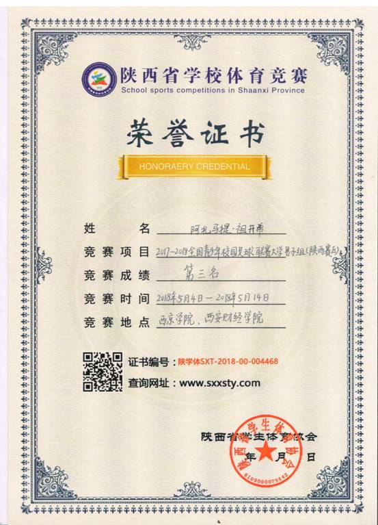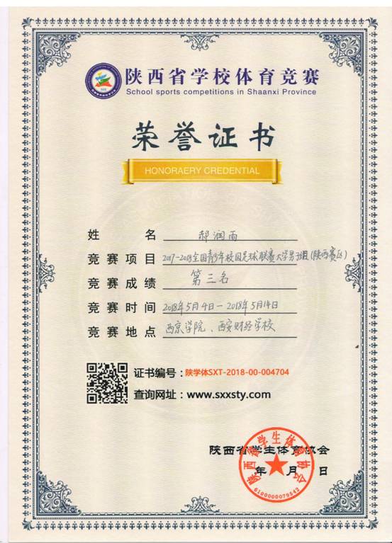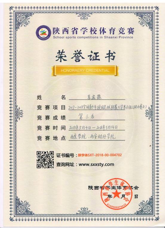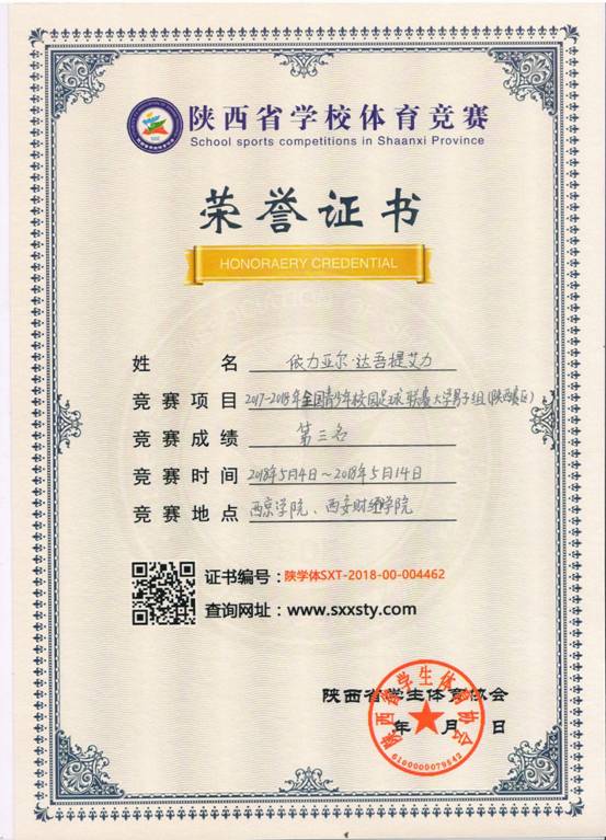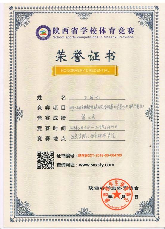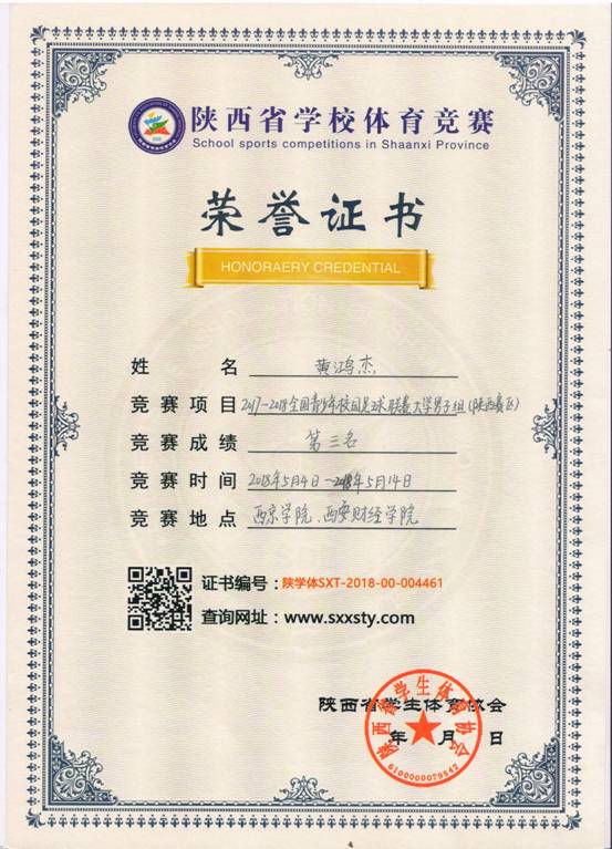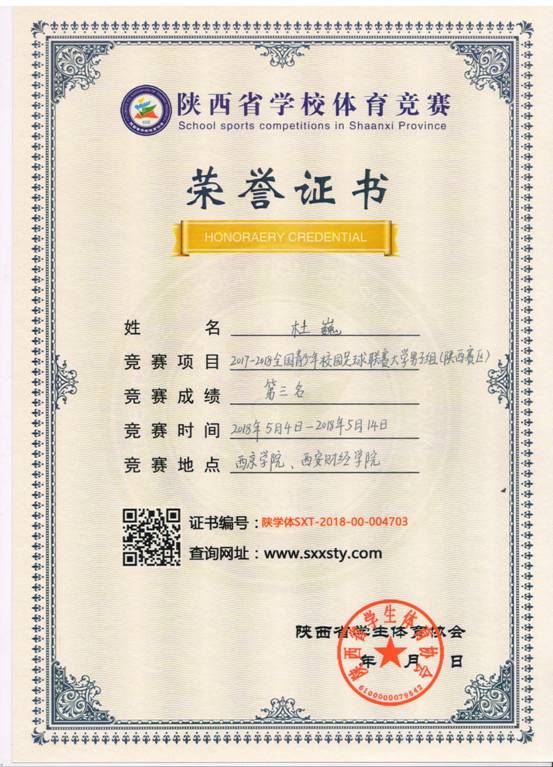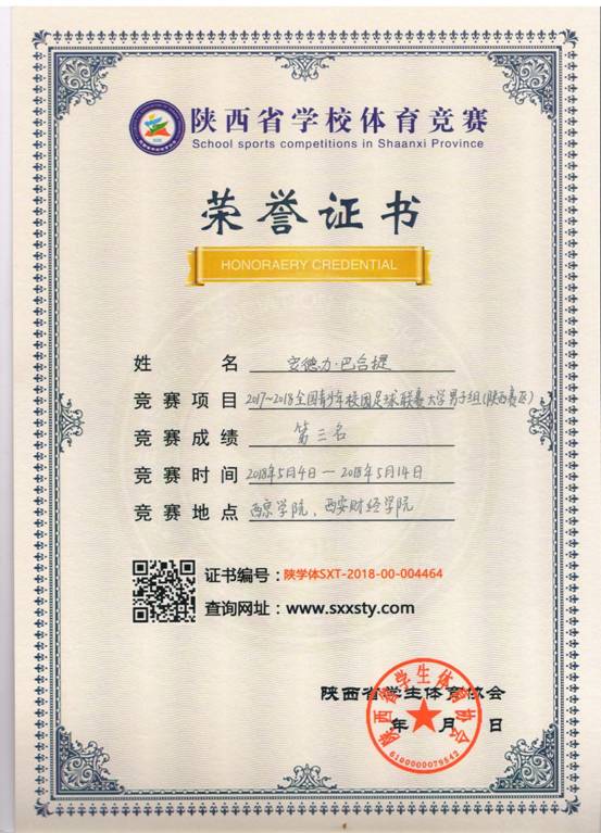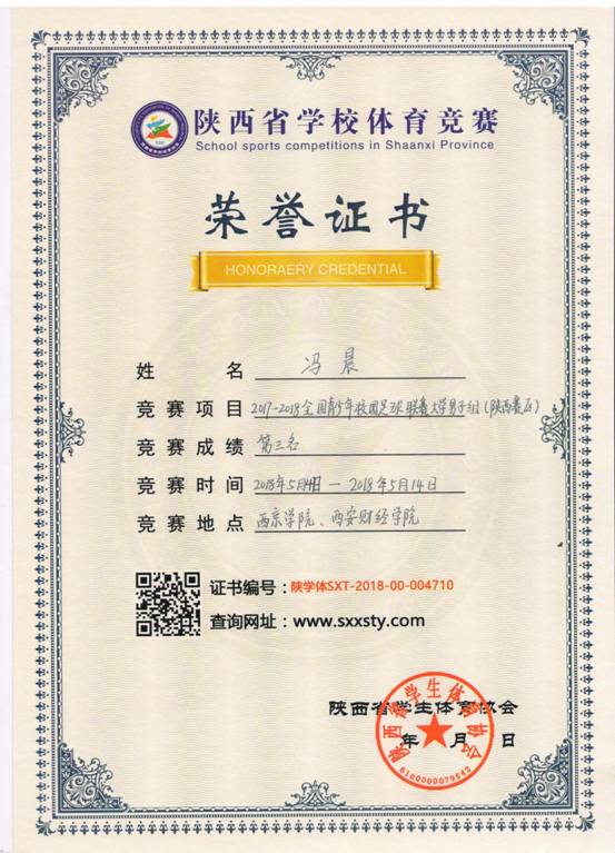 2018全国青少年校园足球联赛大学男子组(陕西赛区)2018年5月4日—14日在西安财经学院、西京学院举行,我校学生足球队取得:第三名