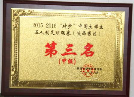 2015-2016年“特步”中国大学生五人制足球联赛于5月27日—6月2日在西安美术学院举行,西电足球队获季军。