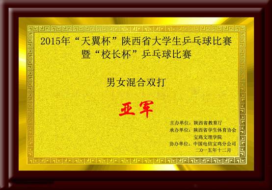 2015年“天翼杯”陕西省大学生乒乓球比赛暨“校长杯”乒乓球比赛男女混合双打亚军