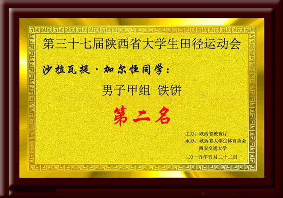 第37届陕西省大学生田径运动会沙拉瓦提·加尔恒男甲铁饼第二名