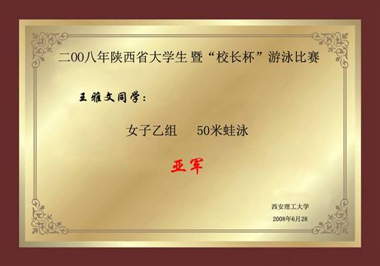 2008年陕西省大学生暨校长杯游泳比赛 女子乙组50米蛙泳亚军