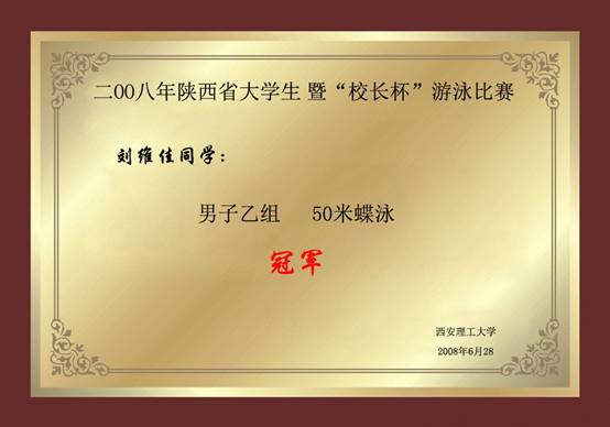 2008年陕西省大学生暨校长杯游泳比赛 刘维佳男子乙组50米蝶泳冠军