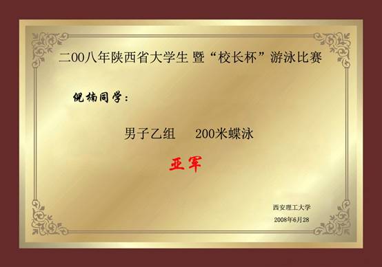 2008年陕西省大学生暨校长杯游泳比赛 熊强男子甲组200米自由泳冠军
